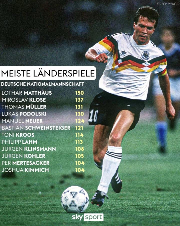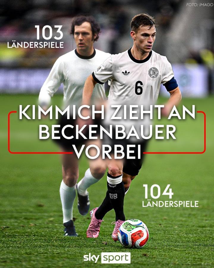 据德国天空体育的数据统计,本场赛事是现年30岁的基米希在德国国家队生涯中的第104次亮相,他因此超越了贝肯鲍尔(103场),在德国国家队队史出场次数排行榜上并列升至第11位。